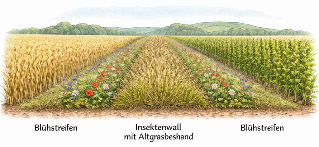 An die Wälle grenzen jeweils etwa 30–40 cm breite Blühstreifen an, sodass sich eine Gesamtbreite von 1,5 bis 2 m ergibt. Im ersten Jahr sollte zur Unterdrückung von Unkraut eine zweimalige Mahd erfolgen. Im Laufe der Zeit etabliert sich auf dem Wall eine Altgrasnarbe. Neben der Deckung für Laufkäfer bietet ein Insektenwall auch eine Überwinterungsmöglichkeit für Wildbienen, im Frühjahr eine Möglichkeit für Bodenbrüter zur ungestörten Aufzucht ihrer Jungen. Im Sommer bietet der Blühstreifen ein reichhaltiges Nahrungsangebot für Bienen, Hummeln, Schwebfliegen und Schmetterlinge.